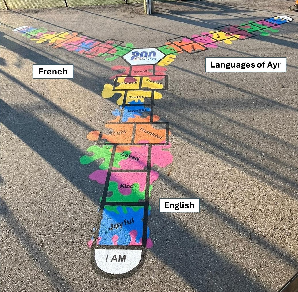 - We designed, created, and as of 22 June 2024 officially donated to North Dumfries Township - in honour of Ayr's 200th birthday - a special hopscotch area. Here is a photo with brief explanation about the three areas of play. click here.